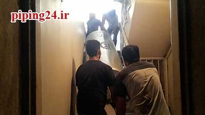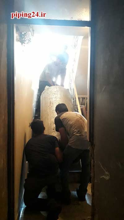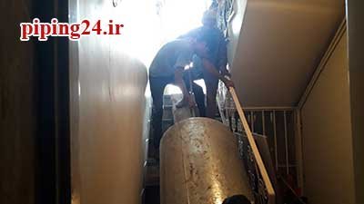 حال نوبت به نصب منبع جدید می رسد که برای این منظور منبع آب گرم دو جداره کویل دار جدید توسط همکاران ما به داخل موتورخانه انتقال پیدا کرد.