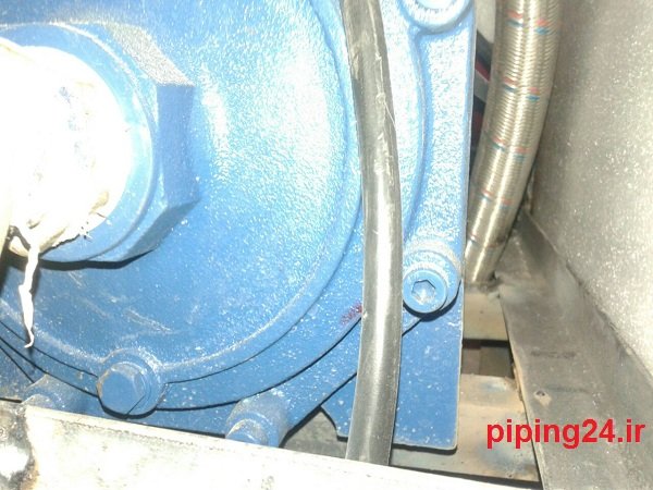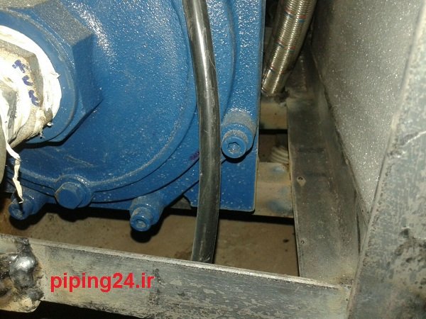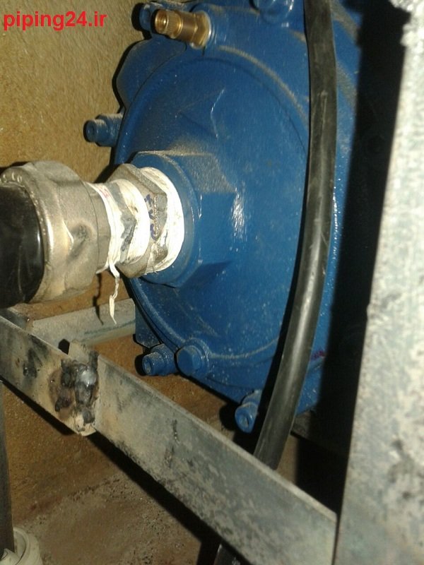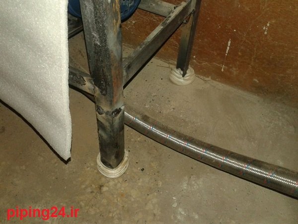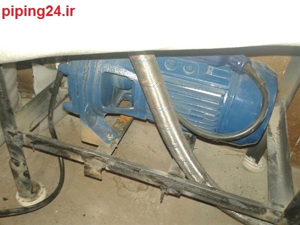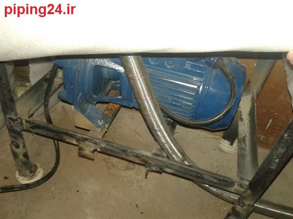 همانگونه که در شکل زیر می بینید شاسی تهیه و با استفاده از پایه های لرزه گیر اماده استقرار شد. ولی به دلیل اینکه لوله کشی پمپ آب خانگی نیاز به تغییراتی جزئی داشت ابتدا پمپ باز و با اتصالات جدید آماده استقرار بر روی شاسی مجهز به لرزه گیر شد.